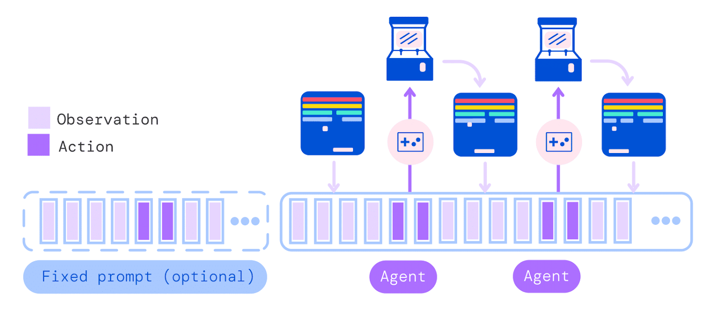 Once all tokens comprising the action vector have been sampled (determined by the action specification of the environment), the action is decoded and sent to the environment which steps and yields a new observation. Then the procedure repeats. The model always sees all previous observations and actions within its context window of 1024 tokens.