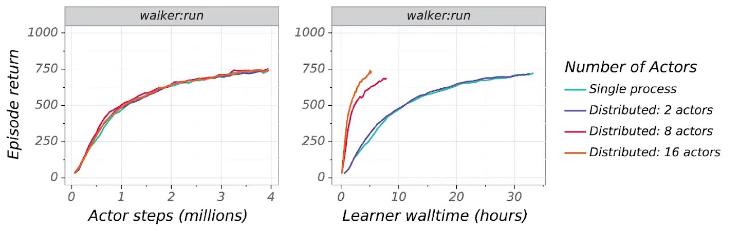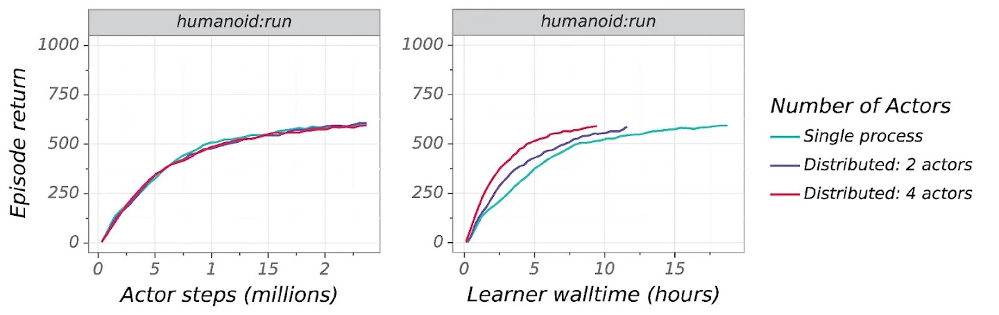 While additional results are readily available in our paper, we show a few plots comparing the performance of a single agent (D4PG) when measured against both actor steps and wall clock time for a continuous control task. Due to the way in which we limit the rate at which data is inserted into replay — refer to the paper for a more in-depth discussion — we can see roughly the same performance when comparing the rewards an agent receives versus the number of interactions it has taken with the environment (actor steps). However, as the agent is further parallelised we see gains in terms of how fast the agent is able to learn. On relatively small domains, where the observations are constrained to small feature spaces, even a modest increase in this parallelisation (4 actors) results in an agent that takes under half the time to learn an optimal policy: