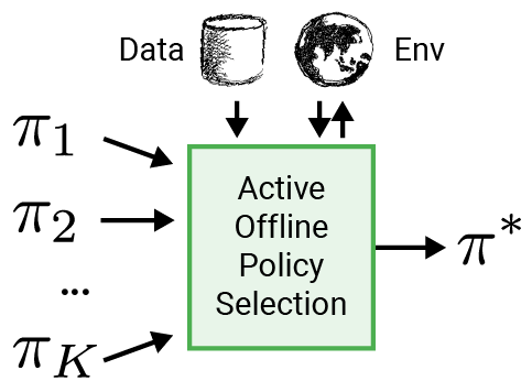 Active offline policy selection (A-OPS) selects the best policy out of a set of policies given a pre-recorded dataset and limited interaction with the environment.