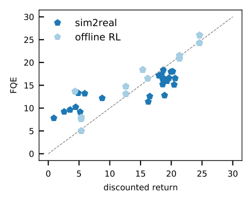 - Off-policy policy evaluation, such as fitted Q-evaluation (FQE), allows us to make an initial guess about the performance of each policy based on an offline dataset. It correlates well with the ground truth performance in many environments, including real-world robotics where it is applied for the first time.