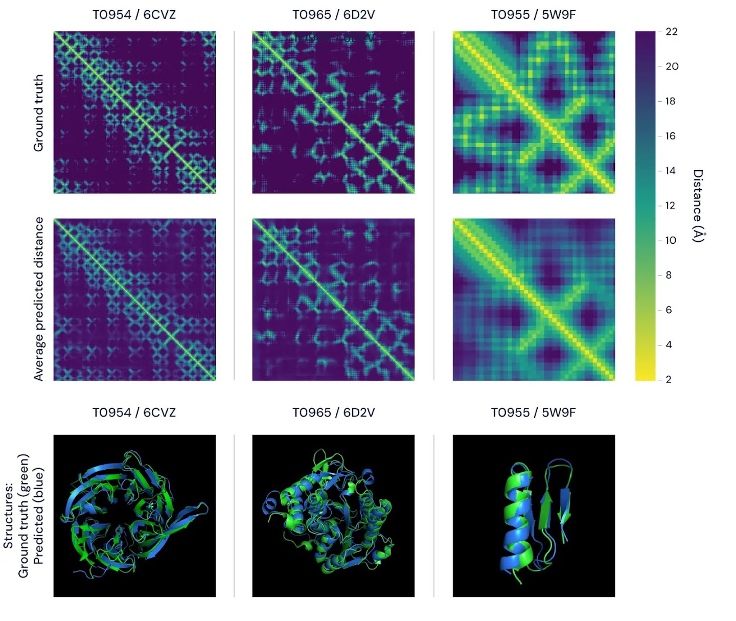Figure 2: Two ways of visualising the accuracy of AlphaFold’s predictions. The top figure features the distance matrices for three proteins. The brightness of each pixel represents the distance between the amino acids in the sequence comprising the protein–the brighter the pixel, the closer the pair. Shown in the top row are the real, experimentally determined distances and, in the bottom row, the average of AlphaFold’s predicted distance distributions. Importantly, these match well on both global and local scales. The bottom panels represent the same comparison using 3D models, featuring AlphaFold’s predictions (blue) versus ground-truth data (green) for the same three proteins.
