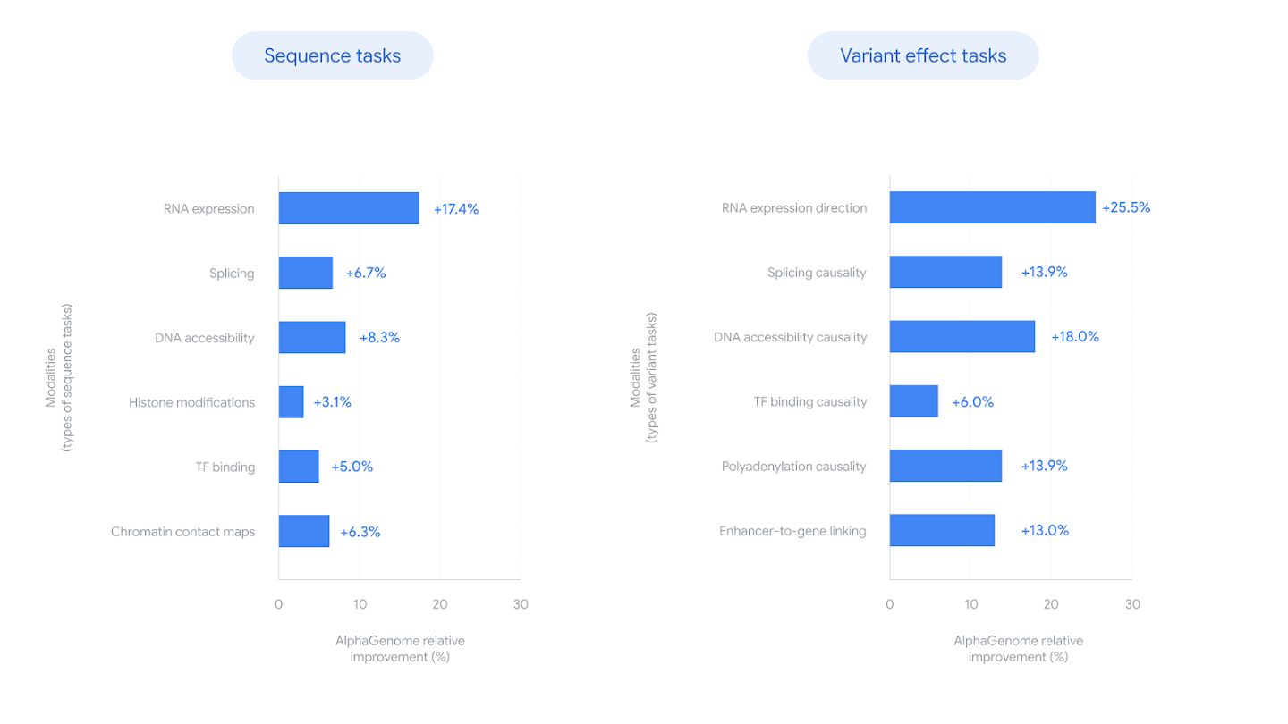AlphaGenome achieves state-of-the-art performance across a wide range of genomic prediction benchmarks, such as predicting which parts of the DNA molecule will be in close proximity, whether a genetic variant will increase or decrease expression of a gene, or whether it will change the gene’s splicing pattern.