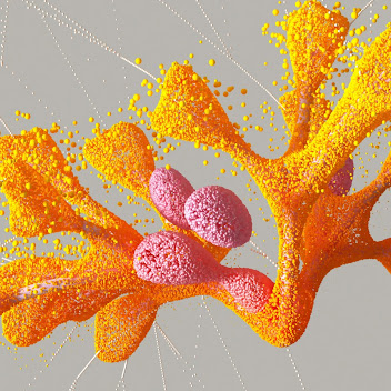 Illustration of a predicted protein binder structure interacting with a target protein. Shown in blue is a predicted protein binder structure generated by AlphaProteo, designed for binding to a target protein. Shown in yellow is the target protein, specifically the SARS-CoV-2 spike receptor-binding domain