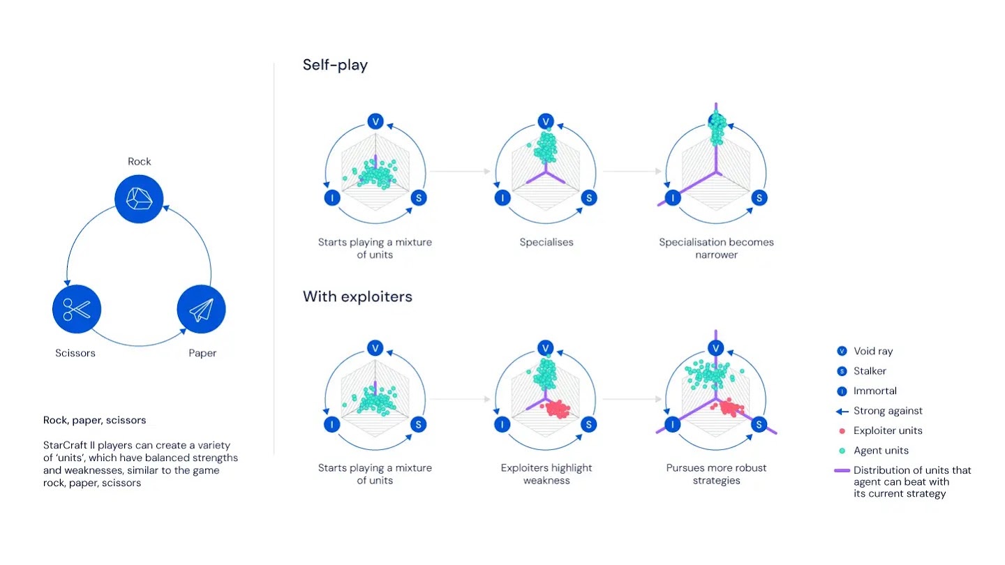 After first open-sourcing StarCraft II as a research environment, we found that even fictitious self-play techniques were insufficient to produce strong agents, so we set out to develop a better, general-purpose solution. A central idea of our recently published Nature paper extends the notion of fictitious self-play to a group of agents – the League. Normally in self-play, every agent maximises its probability of winning against its opponents; however, this was only part of the solution. In the real world, a player trying to improve at StarCraft may choose to do so by partnering with friends so that they can train particular strategies. As such, their training partners are not playing to win against every possible opponent, but are instead exposing the flaws of their friend, to help them become a better and more robust player. The key insight of the League is that playing to win is insufficient: instead, we need both main agents whose goal is to win versus everyone, and also exploiter agents that focus on helping the main agent grow stronger by exposing its flaws, rather than maximising their own win rate against all players. Using this training method, the League learns all its complex StarCraft II strategy in an end-to-end, fully automated fashion.
