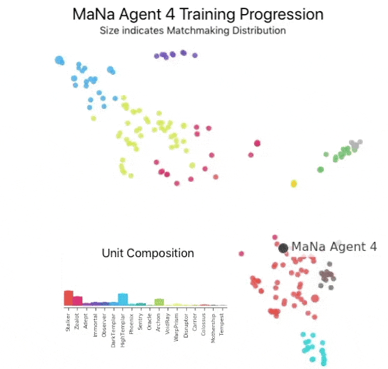 The figure shows how one agent (black dot), which was ultimately selected to play against MaNa, evolved its strategy and competitors (coloured dots) during the course of training. Each dot represents a competitor in the AlphaStar league. The position of the dot represents its strategy (inset), and the size of the dot represents how frequently it is selected as an opponent for the MaNa agent during training.