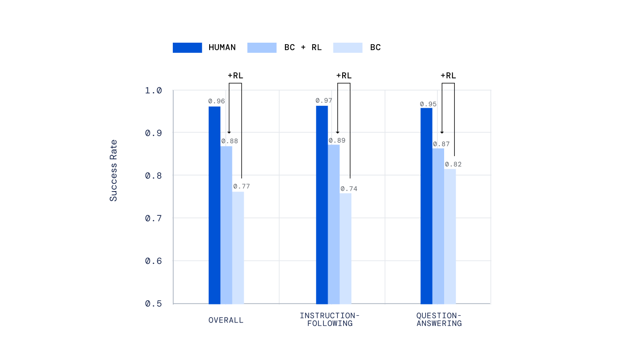 We used a variety of independent mechanisms to evaluate our agents, from hand-scripted tests to a new mechanism for offline human scoring of open-ended tasks created by people, developed in our previous work Evaluating Multimodal Interactive Agents. Importantly, we asked people to interact with our agents in real-time and judge their performance. Our agents trained by RL performed much better than those trained by imitation learning alone.