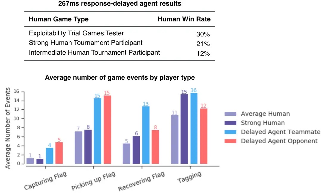 The win rates of human players against response-delayed agents are low, indicating that even with human-comparable reaction delays, agents outperform human players. In addition, looking at the average number of game events by humans and response-delayed agents, we see comparable numbers of tagging events, showing that these agents do not have an advantage over humans in this respect.