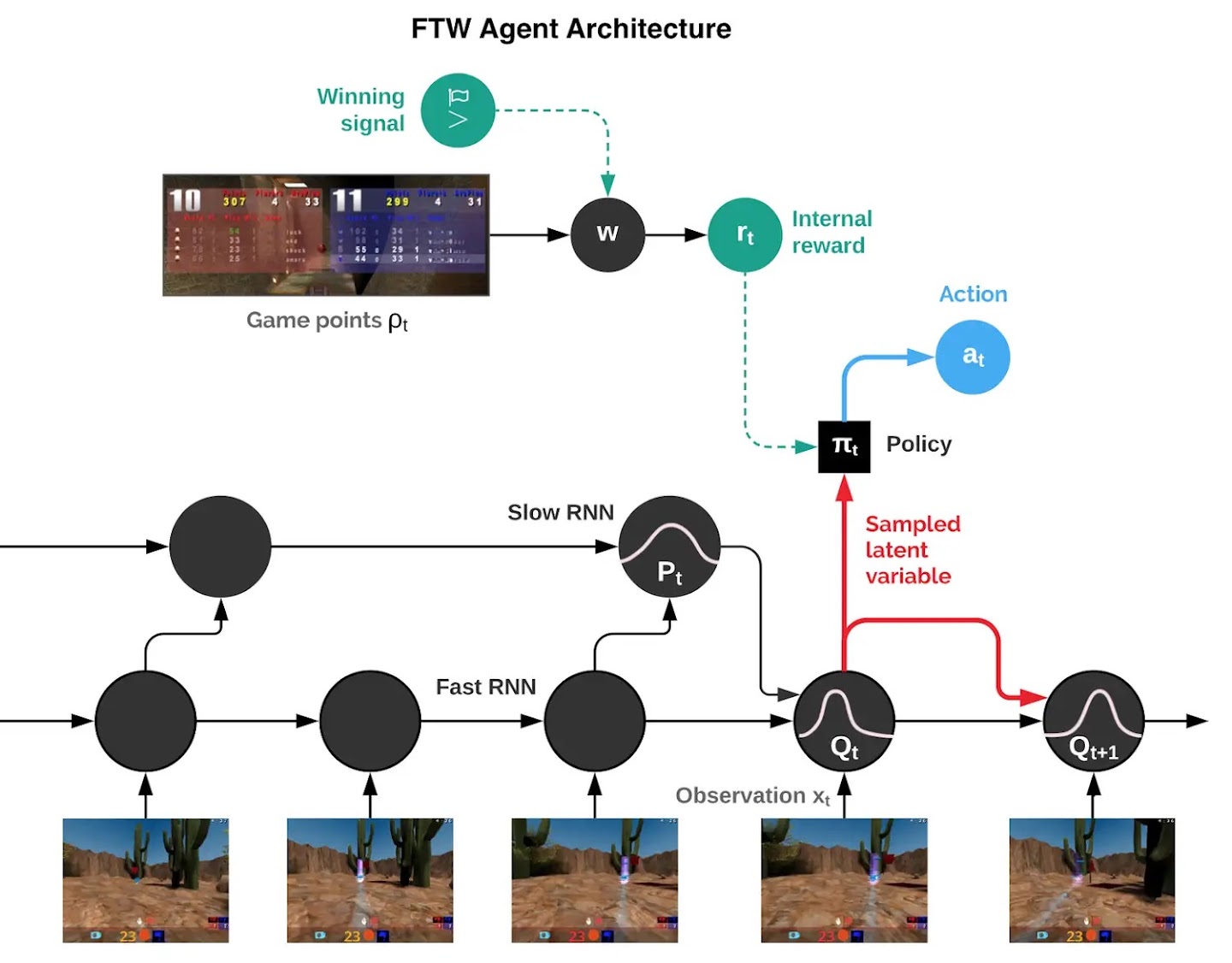 - Each agent in the population learns its own internal reward signal, which allows agents to generate their own internal goals, such as capturing a flag. A two-tier optimisation process optimises agents’ internal rewards directly for winning, and uses reinforcement learning on the internal rewards to learn the agents’ policies.