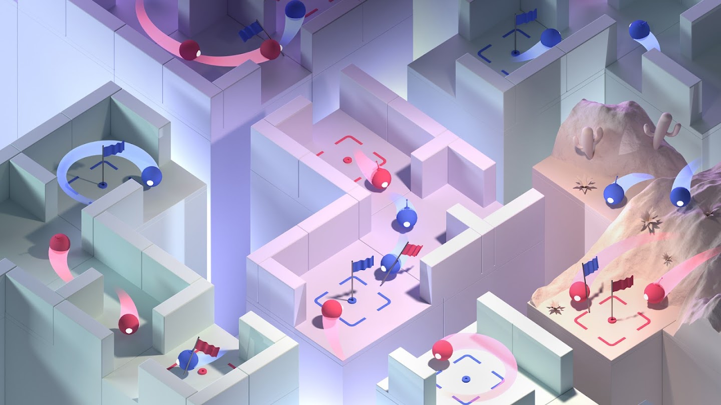 The rules of CTF are simple, but the dynamics are complex. Two teams of individual players compete on a given map with the goal of capturing the opponent team’s flag while protecting their own. To gain tactical advantage they can tag the opponent team members to send them back to their spawn points. The team with the most flag captures after five minutes wins.