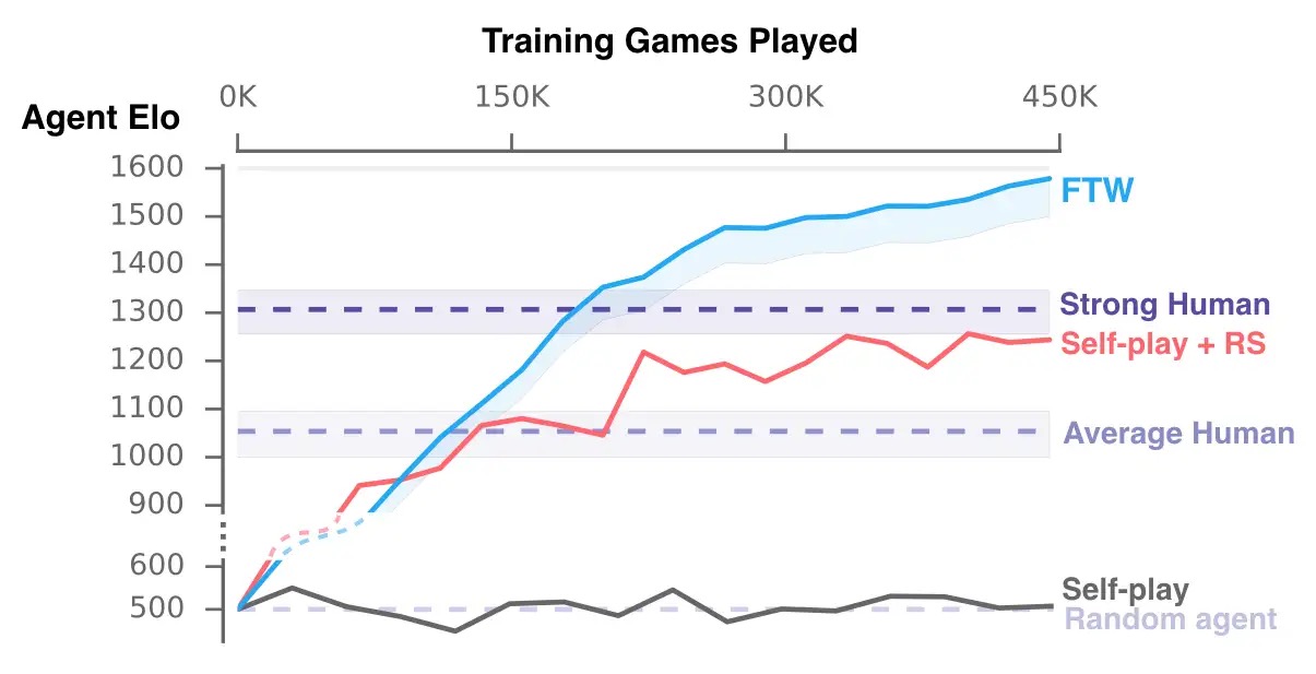 The performance of our agents during training. Our new agent, the FTW agent, obtains a much higher Elo rating - which corresponds to the probability of winning - than the human players and baseline methods of Self-play + RS and Self-play.