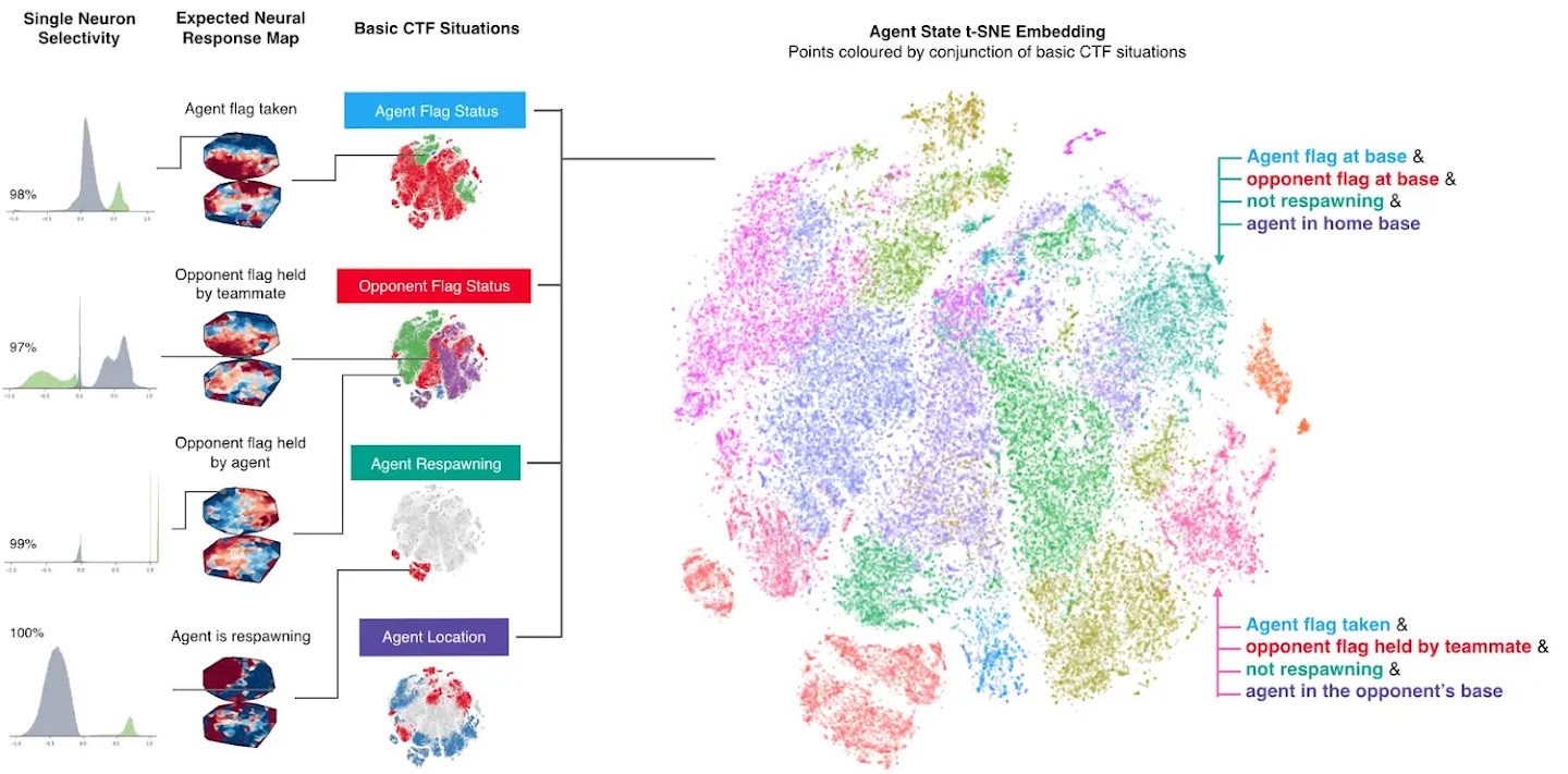 To understand how agents represent game state, we look at activation patterns of the agents’ neural networks plotted on a plane. Dots in the figure below represent situations during play with close by dots representing similar activation patterns. These dots are coloured according to the high-level CTF game state in which the agent finds itself: In which room is the agent? What is the status of the flags? What teammates and opponents can be seen? We observe clusters of the same colour, indicating that the agent represents similar high-level game states in a similar manner.