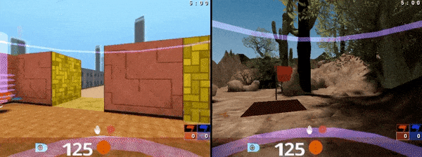 Agents playing two other Quake III Arena multiplayer game modes on full-scale tournament maps: Harvester on the Future Crossings map (left) and One Flag Capture the Flag on the Ironwood map (right), with all the pickups and gadgets of the full game.