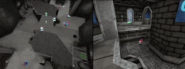 The game we focused on in this work is Quake III Arena (which we aesthetically modified, though all game mechanics remain the same). Quake III Arena has laid the foundations for many modern first-person video games, and has attracted a long-standing competitive e-sports scene. We train agents that learn and act as individuals, but which must be able to play on teams with and against any other agents, artificial or human.