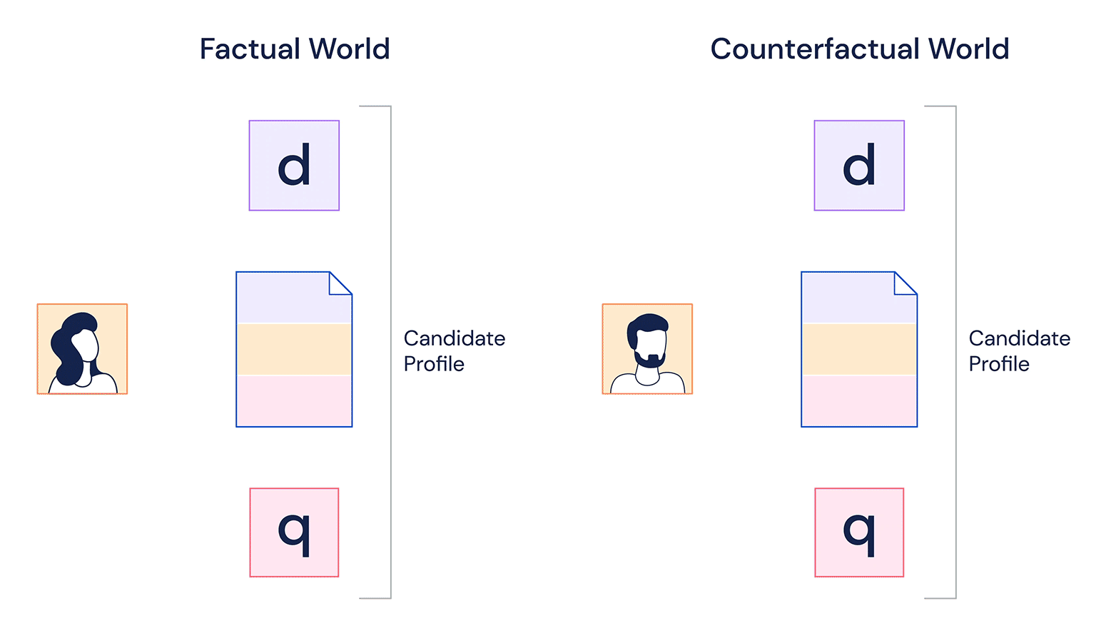 The additional use of counterfactual inference techniques would enable us to ask if a specific individual was treated unfairly, for example by asking whether a rejected female applicant (G=1, Q=q, D=d, A=0) would have obtained the same decision in a counterfactual world in which her gender were male along the direct path G→A. In this simple example, assuming that the admission decision is obtained as the deterministic function f of G, Q, and D, i.e., A = f(G, Q, D), this corresponds to asking if f(G=0, Q=q, D=d) = 0, namely if a male applicant with the same department choice and qualifications would have also been rejected. We exemplify this in Figure 3 by re-computing the admission decision after changing the female candidate's photo to a male one in the profile.