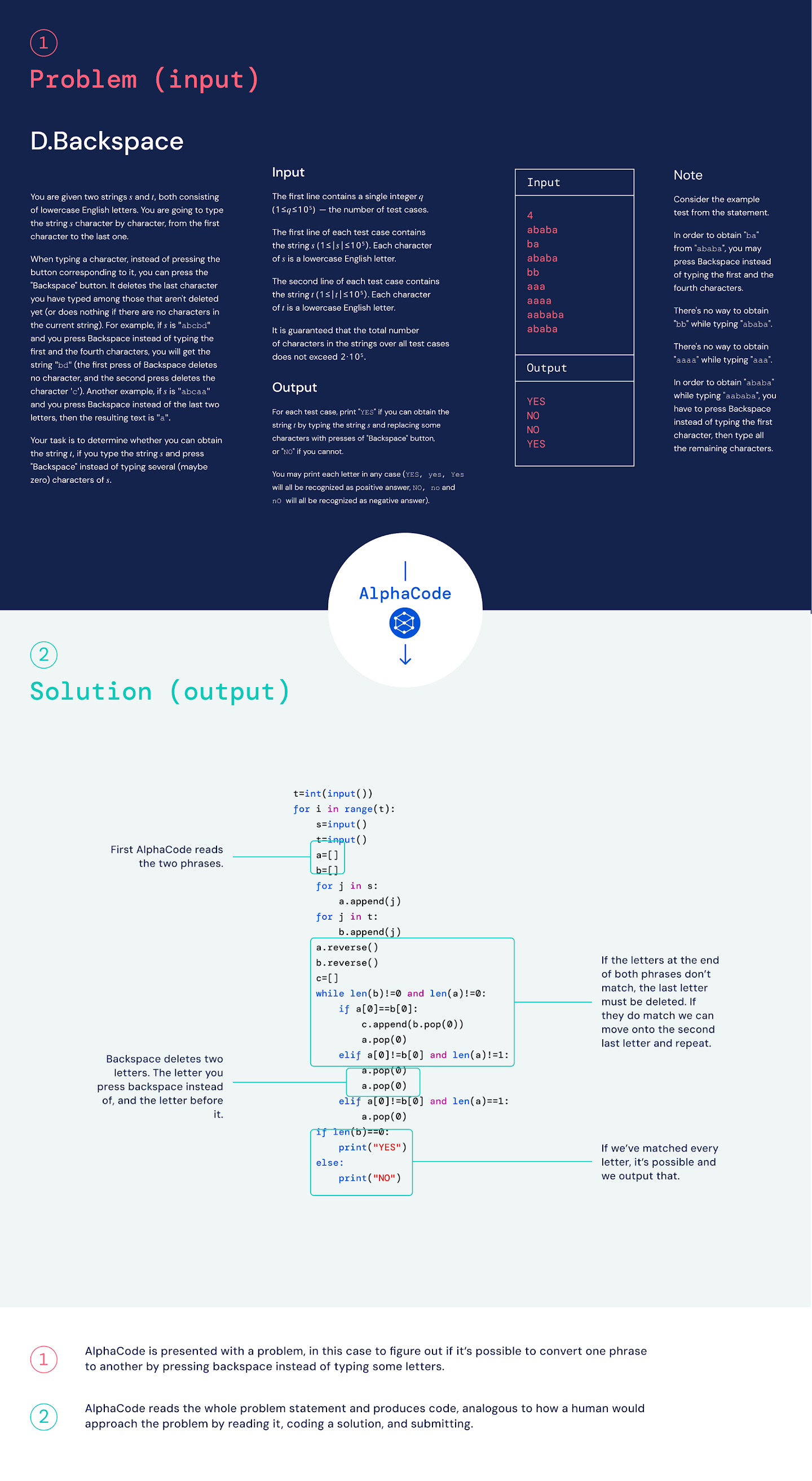 Solving competitive programming problems is a really hard thing to do, requiring both good coding skills and problem solving creativity in humans. I was very impressed that AlphaCode could make progress in this area, and excited to see how the model uses its statement understanding to produce code and guide its random exploration to create solutions.