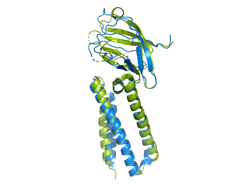 The best CASP_commons prediction by AlphaFold is indicated in blue, and the experimental structure is in green.