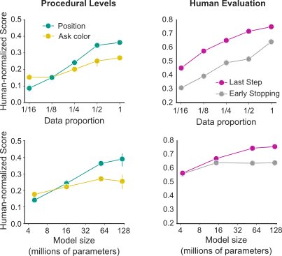 Scripted probe tasks performance and human evaluation for data and model scaling. In both cases performance improvements when increasing both dataset size and model size.