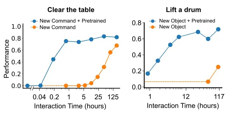 When learning a new command or object, the agent’s performance quickly improves with mere hours of demonstration experience.