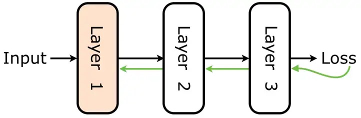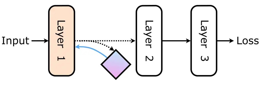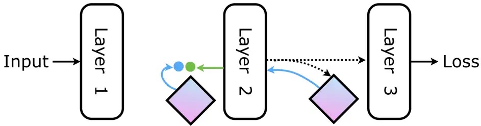 Here, after Layer 1 has processed the input, it can only be updated after the output activations (black lines) have been propagated through the rest of the network, generated a loss, and the error gradients (green lines) backpropagated through every layer until Layer 1 is reached. This sequence of operations means that Layer 1 has to wait for the forwards and backwards computation of Layer 2 and Layer 3 before it can update. Layer 1 is locked, coupled, to the rest of the network.