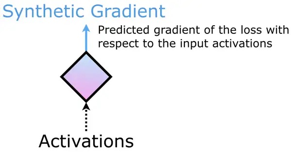 The synthetic gradient model takes in the activations from a module and produces what it predicts will be the error gradients - the gradient of the loss of the network with respect to the activations.