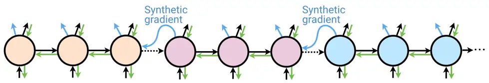 Or a big distributed network spread over multiple machines. Sometimes requiring all modules in a network to wait for all other modules to execute and backpropagate gradients is overly time consuming or even intractable. If we decouple the interfaces - the connections - between modules, every module can be updated independently, and is not locked to the rest of the network.