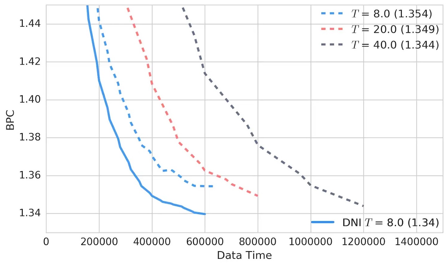 This graph shows the application of an RNN trained on next character prediction on Penn Treebank, a language modelling problem. On the y-axis the bits-per-character (BPC) is given, where smaller is better. The x-axis is the number of characters seen by the model as training progresses. The dotted blue, red and grey lines are RNNs trained with truncated BPTT, unrolled for 8 steps, 20 steps and 40 steps - the higher the number of steps the RNN is unrolled before performing backpropagation through time, the better the model is, but the slower it trains. When DNI is used on the RNN unrolled 8 steps (solid blue line) the RNN is able to capture the long term dependency of the 40-step model, but is trained twice as fast (both in terms of data and wall clock time on a regular desktop machine with a single GPU).