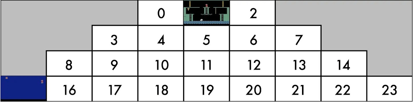While we've successfully trained agents to super-human performance on many Atari 2600 games, some games remain elusively difficult. One of our favourite "hard" games is Montezuma's Revenge. Montezuma's Revenge is famous for its hostile, unforgiving environment, where the agent must navigate a maze of rooms filled with traps. Each level has 24 rooms, is shaped like a pyramid, and looks like this: