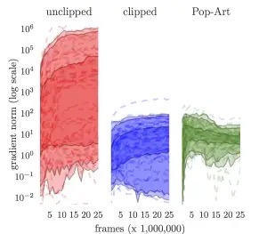 Double DQN is shown with unclipped rewards on the left, with the clipped rewards in the middle, and with Pop-Art is on the right. Pop-Art results in much more consistent gradients, whose magnitudes fall into a much narrower, and therefore more predictable, range. The unclipped version is much more erratic – note the log scale on the y-axis. Pop-Art even has better-normalized gradients than the clipped variant, without qualitatively changing the task as the clipping does. For some games, the resulting performance is much better than previous state of the art.