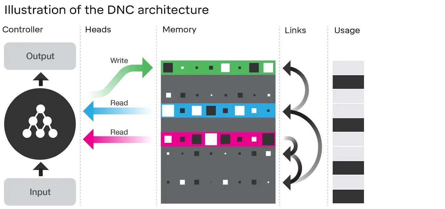 Illustration of the DNC architecture. The neural network controller receives external inputs and, based on these, interacts with the memory using read and write operations known as 'heads'. To help the controller navigate the memory, DNC stores 'temporal links' to keep track of the order things were written in, and records the current 'usage' level of each memory location.
