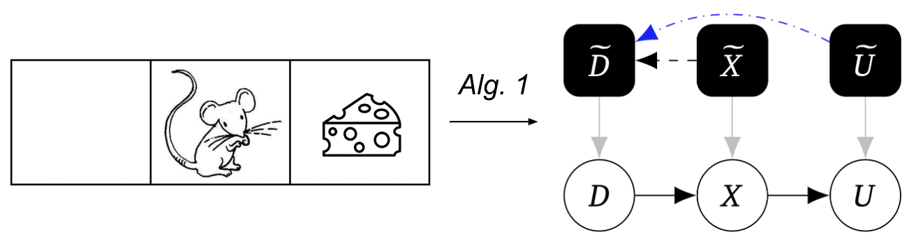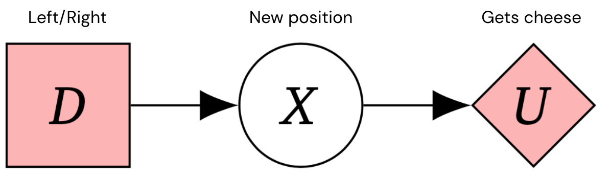 CID for the mouse. D represents the decision of left/right. X is the mouse’s new position after taking the action left/right (it might slip, ending up on the other side by accident). U represents whether the mouse gets cheese or not.