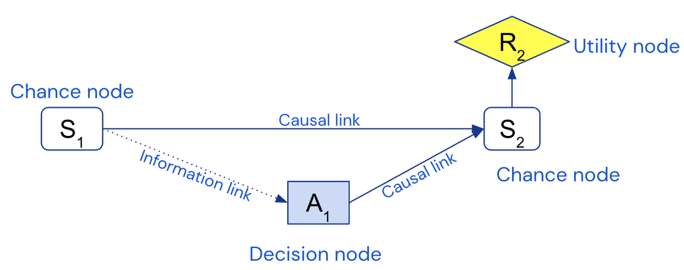 S1 represents the initial state, A1 represents the agent’s decision (square), S2 the next state. R2 is the agent’s reward/utility (diamond). Solid links specify causal influence. Dashed edges specify information links – what the agent knows when making its decision.