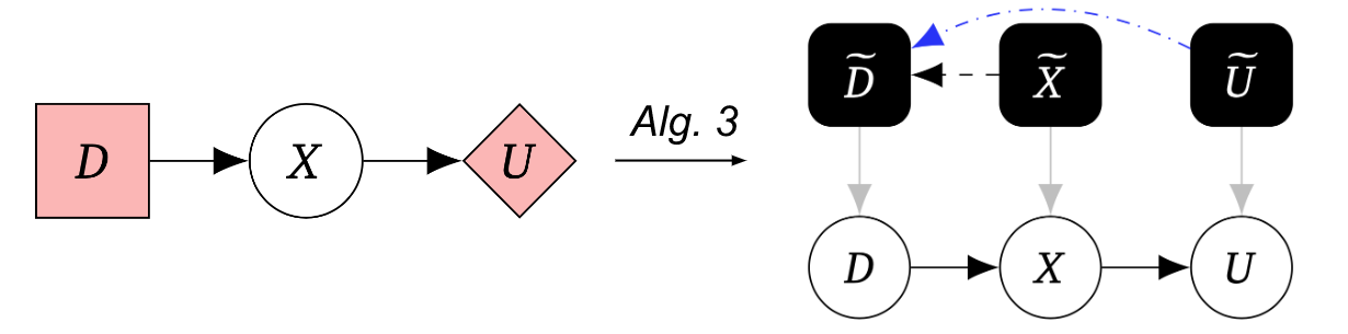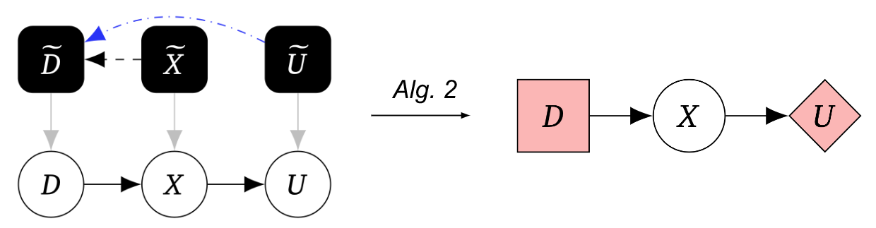 Algorithm 2 takes as input a mechanised causal graph and maps it to a game graph. An ingoing terminal edge indicates a decision, an outgoing one indicates a utility.