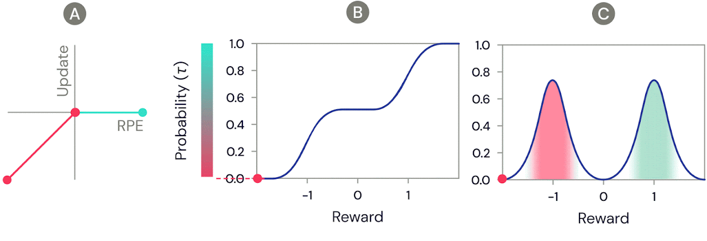 One of the simplest distributional reinforcement learning algorithms is very closely related to standard TD, and is called distributional TD. Whereas standard TD learns a single prediction – the average expected reward – a distributional TD network learns a set of distinct predictions. Each of these is learned through the same method as standard TD – by computing a reward prediction error that describes the difference between consecutive predictions. But the crucial ingredient is that each predictor applies a different transformation to its reward prediction errors. Some predictors "amplify" or "overweight" their reward prediction errors (RPE) selectively when the reward prediction error is positive (Figure 2a). This causes the predictor to learn a more optimistic reward prediction, corresponding to a higher part of the reward distribution. Other predictors amplify their negative reward prediction errors (Figure 2a), and so learn more pessimistic predictions. All together, a set of predictors with a diverse set of pessimistic and optimistic weightings map out the full reward distribution (Figure 2b, 2c).