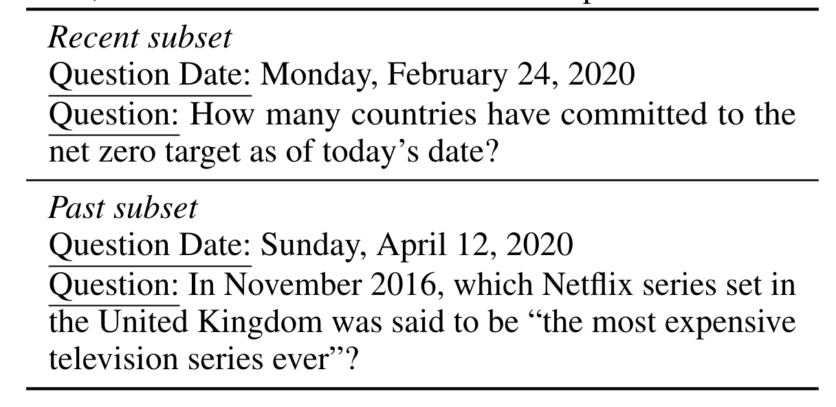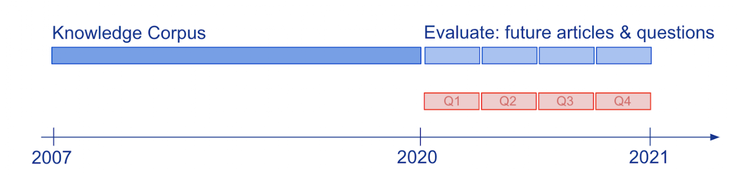Figure 1. We evaluate our models on unseen language and knowledge, seen here using questions about events in 2020, while the model has been trained on data up until the end of 2019.