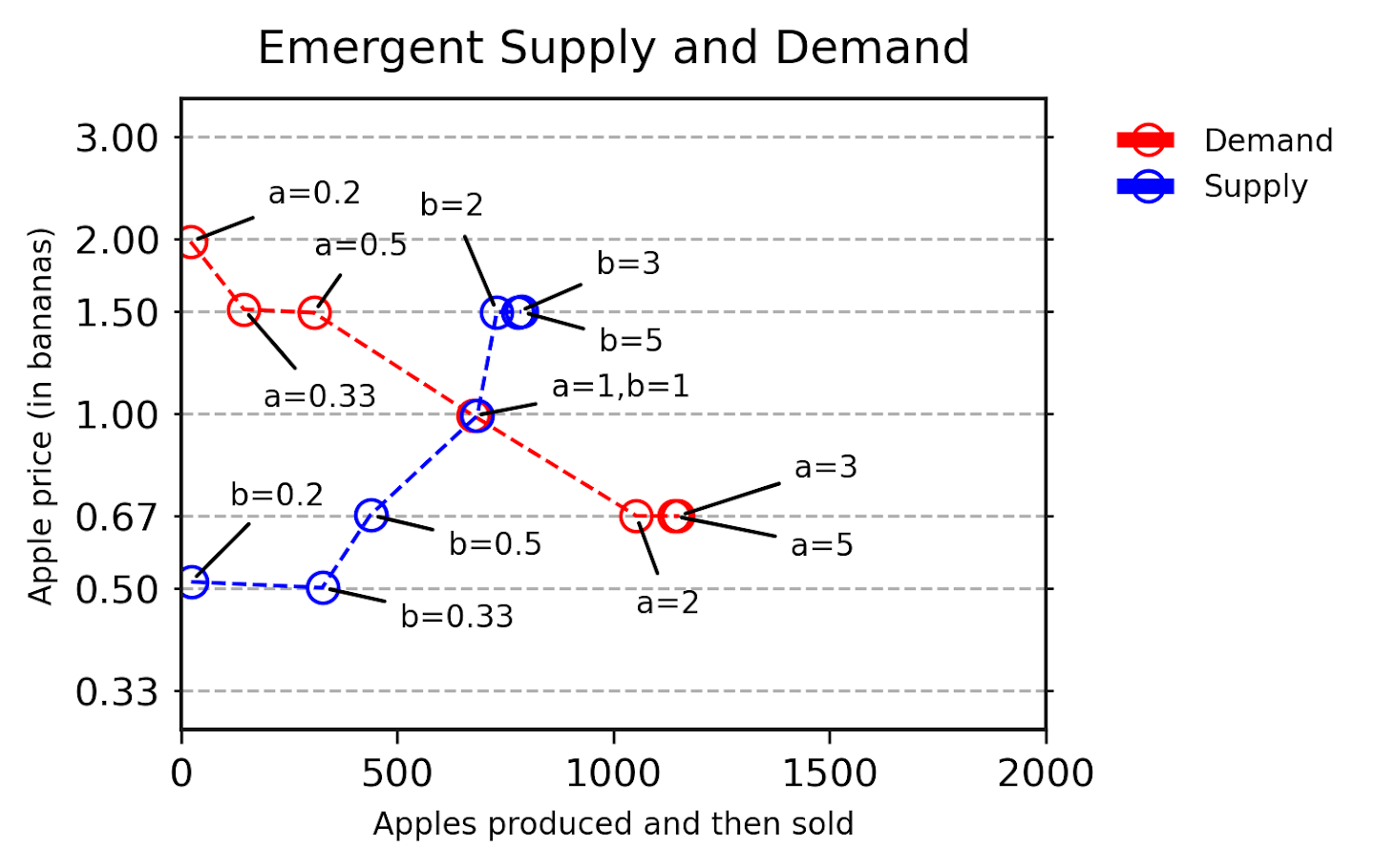 Emergent Supply and Demand curves: In this experiment, we manipulate the probability of apple trees (a=x) and banana trees (b=y) appearing in each map location. These results replicate the theoretical supply and demand curves presented in introductory Microeconomics courses.