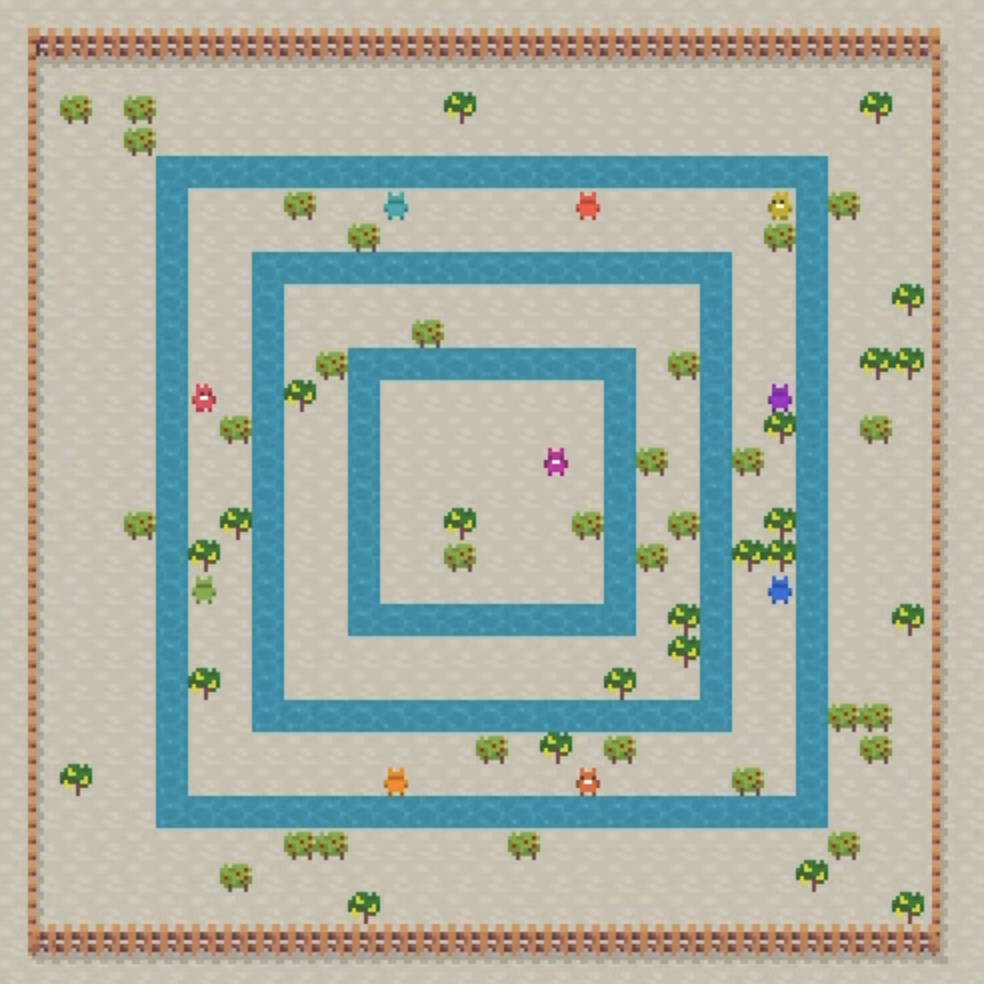 An example map in Fruit Market: Agents move around the map to harvest apples and bananas from trees, meet up to trade with each other, and then consume the fruit that they prefer.