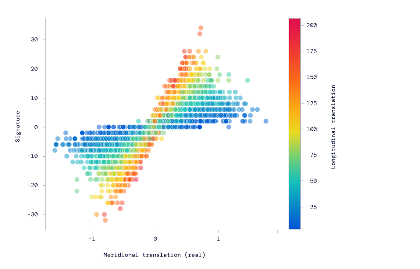 Our models highlight previously undiscovered structure that guided us to surprising new mathematical results. Shown here is a striking relationship between the geometry and signature of a knot. The geometry of a knot has to do with its shape (e.g. it’s volume) when measured in a canonical way. The signature is an algebraic invariant which can be calculated by looking at the way the knot crosses itself and twists.