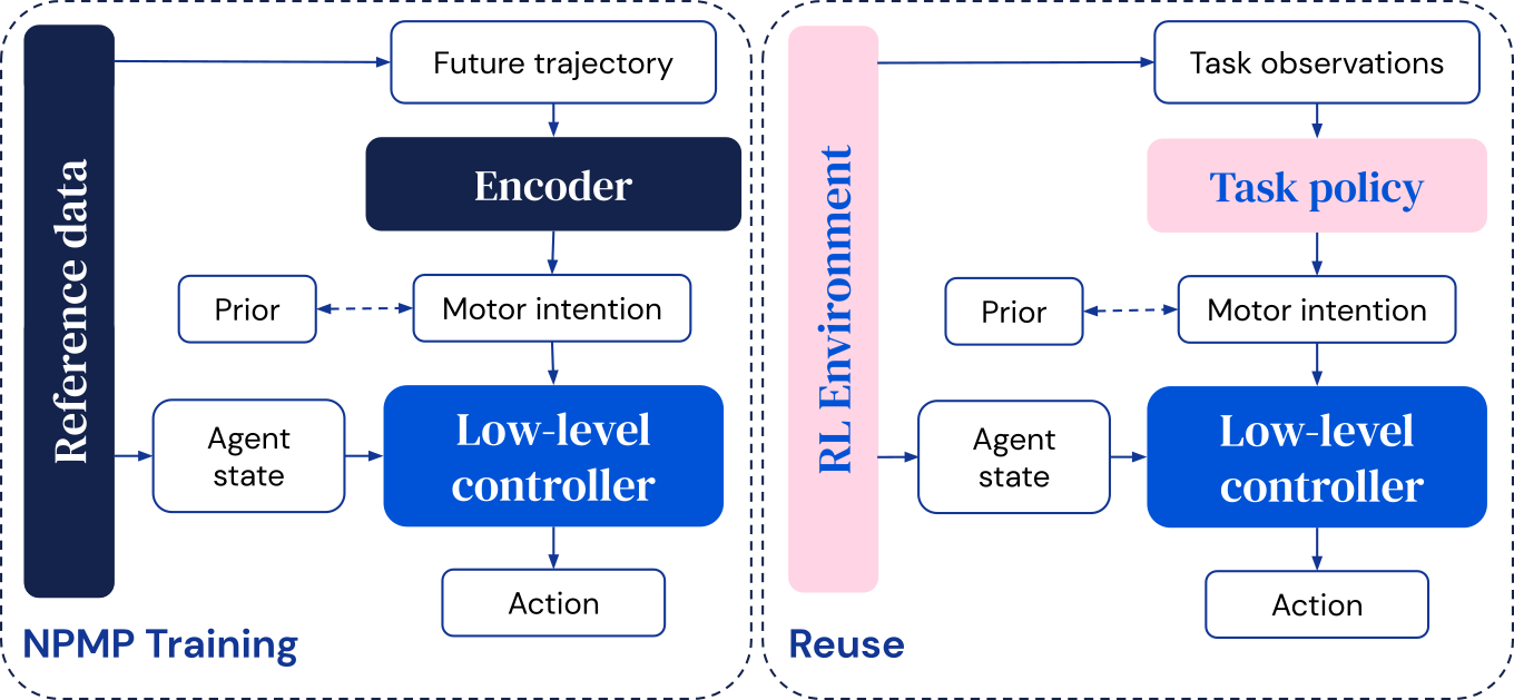 Our NPMP model first distils reference data into a low-level controller (left). This low-level controller can then be used as a plug-and-play motor control module on a new task (right).