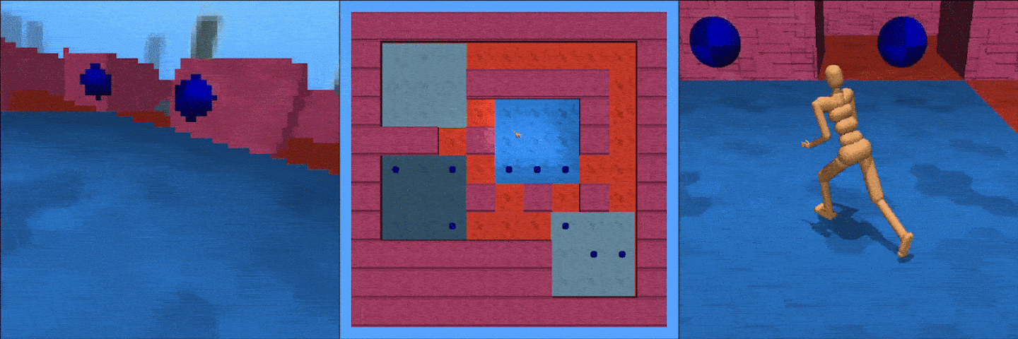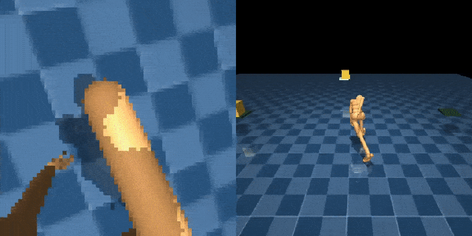 Learning to interact with objects using the arms is another difficult control challenge. The NPMP can also enable this type of whole-body manipulation. With a small amount of MoCap data of interacting with boxes, we’re able to train an agent to carry a box from one location to another, using egocentric vision and with only a sparse reward signal: