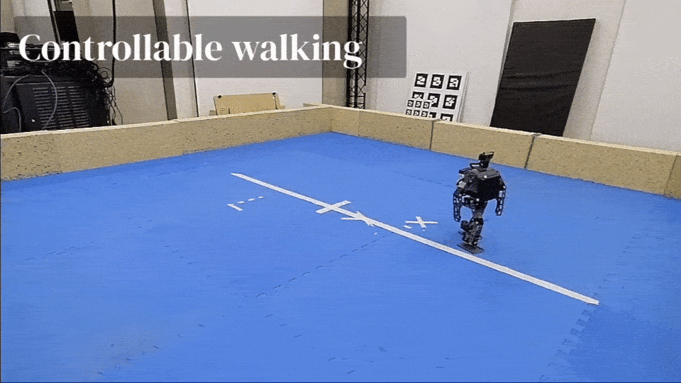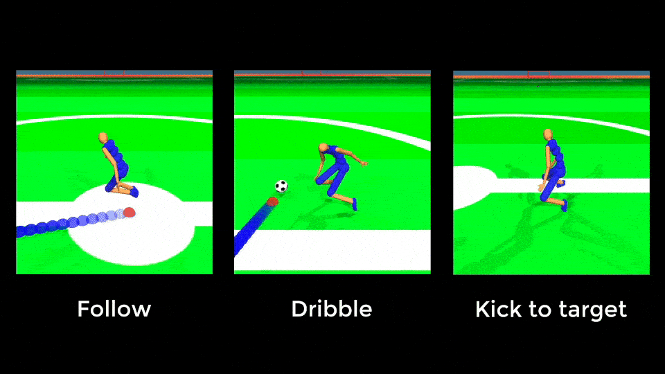 Locomotion skills can then be reused for controllable walking and ball dribbling.