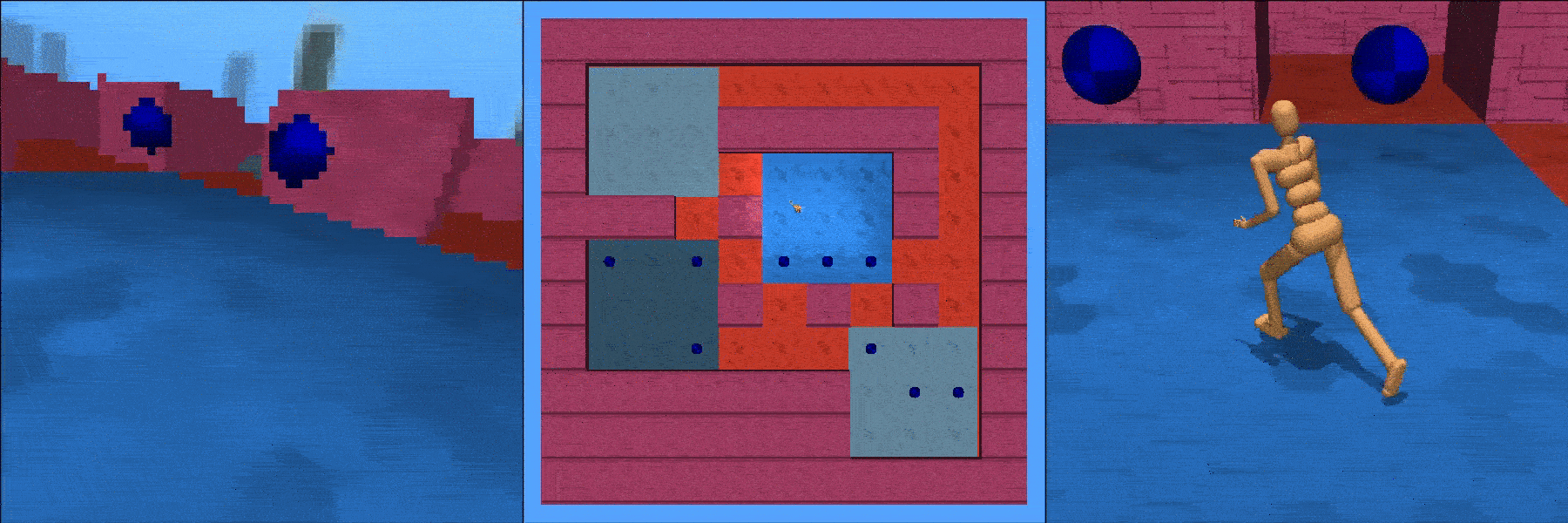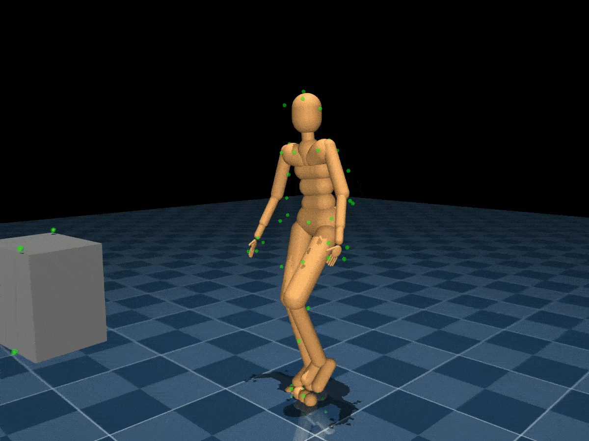 Simulated humanoid collecting blue spheres in a maze.
