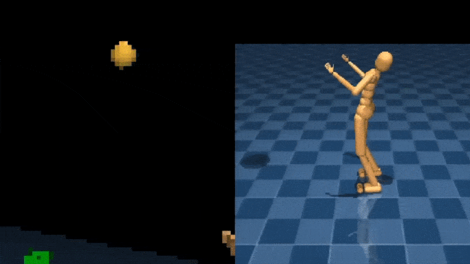 Simulated humanoid catching and throwing a ball.