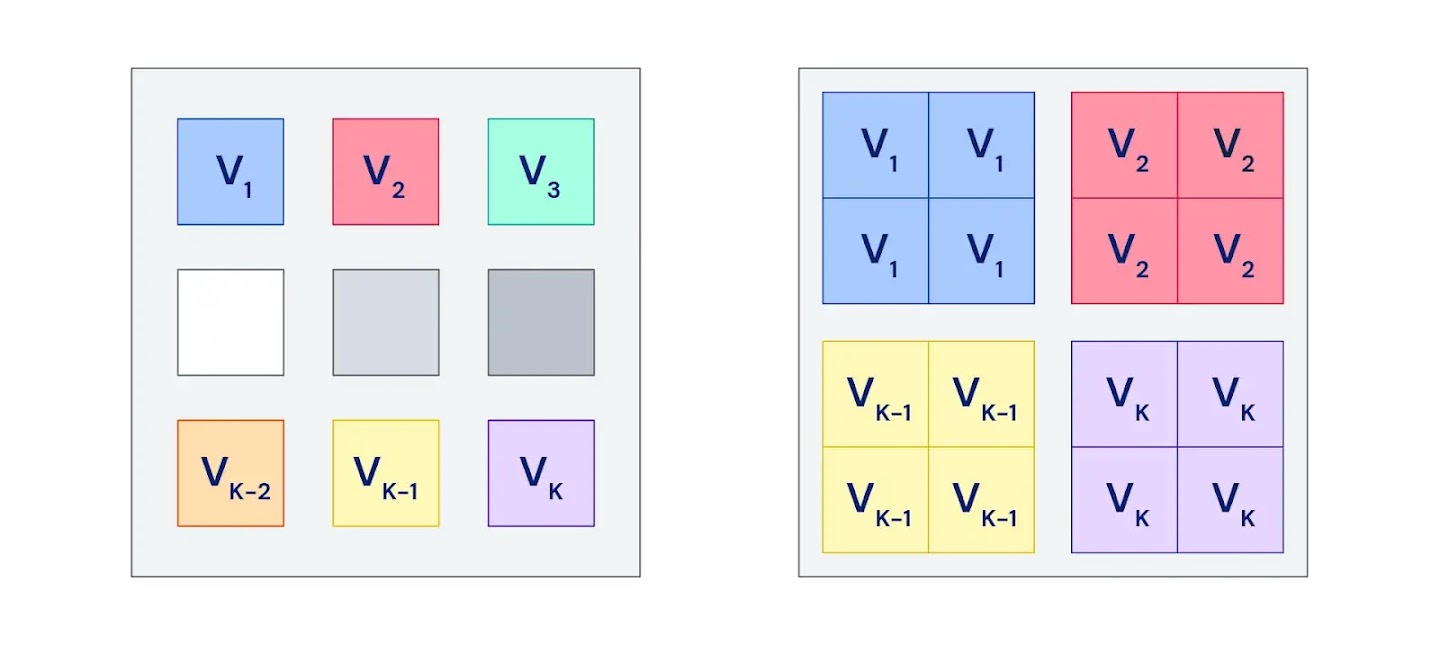 Figure 5. Each coloured square is a separate device. (L) Each player lives and computes updates on a single device. (R) Each player is copied to multiple devices and computes updates using independent batches of data; the different updates are then averaged to form a more robust update direction.