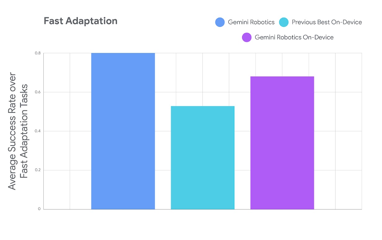 Gemini Robotics On-Device is the first VLA model we're making available for fine-tuning. While many tasks will work out of the box, developers can also choose to adapt the model to achieve better performance for their applications. Our model quickly adapts to new tasks, with as few as 50 to 100 demonstrations — indicating how well this on-device model can generalize its foundational knowledge to new tasks.