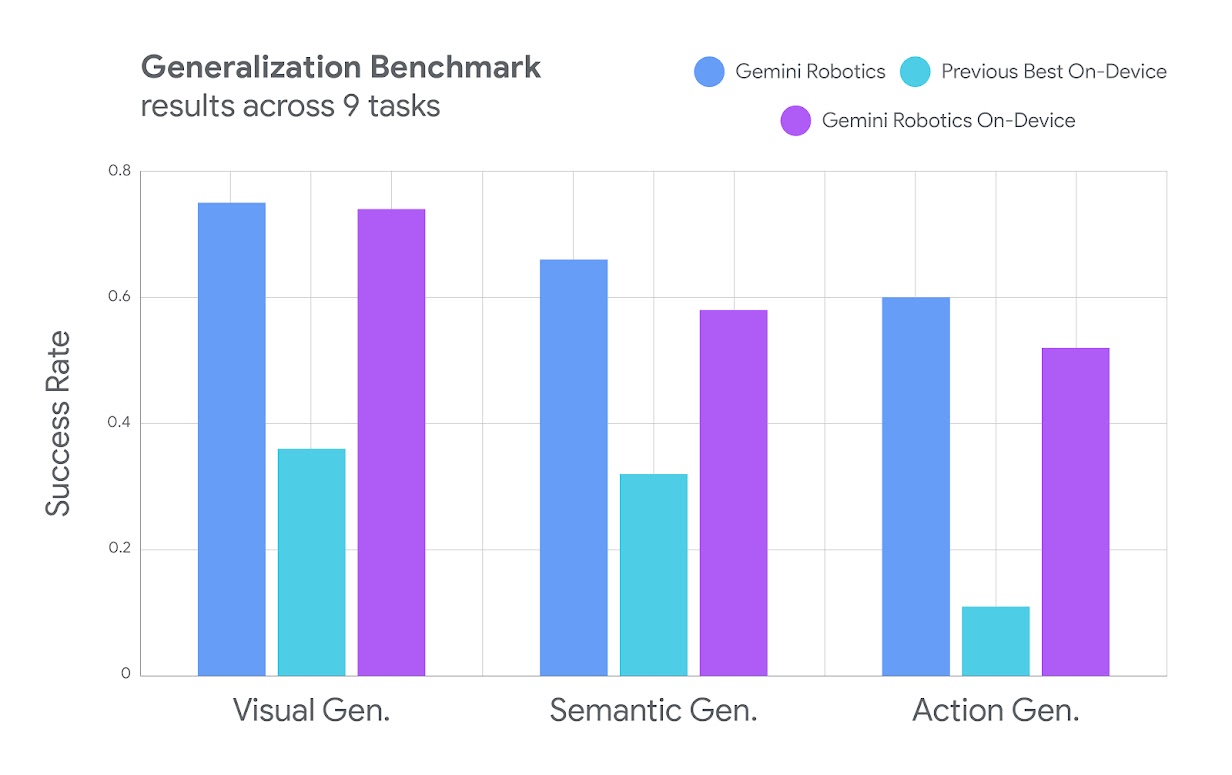 Chart evaluating Gemini Robotics On-Device’s generalization performance, compared to our flagship Gemini Robotics model and the previous best on-device model.