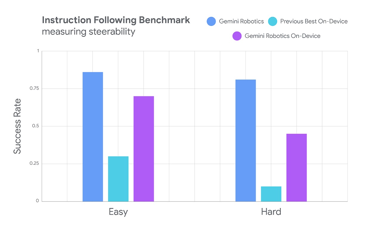 Chart evaluating Gemini Robotics On-Device’s instruction following performance, compared to our flagship Gemini Robotics model and the previous best on-device model.