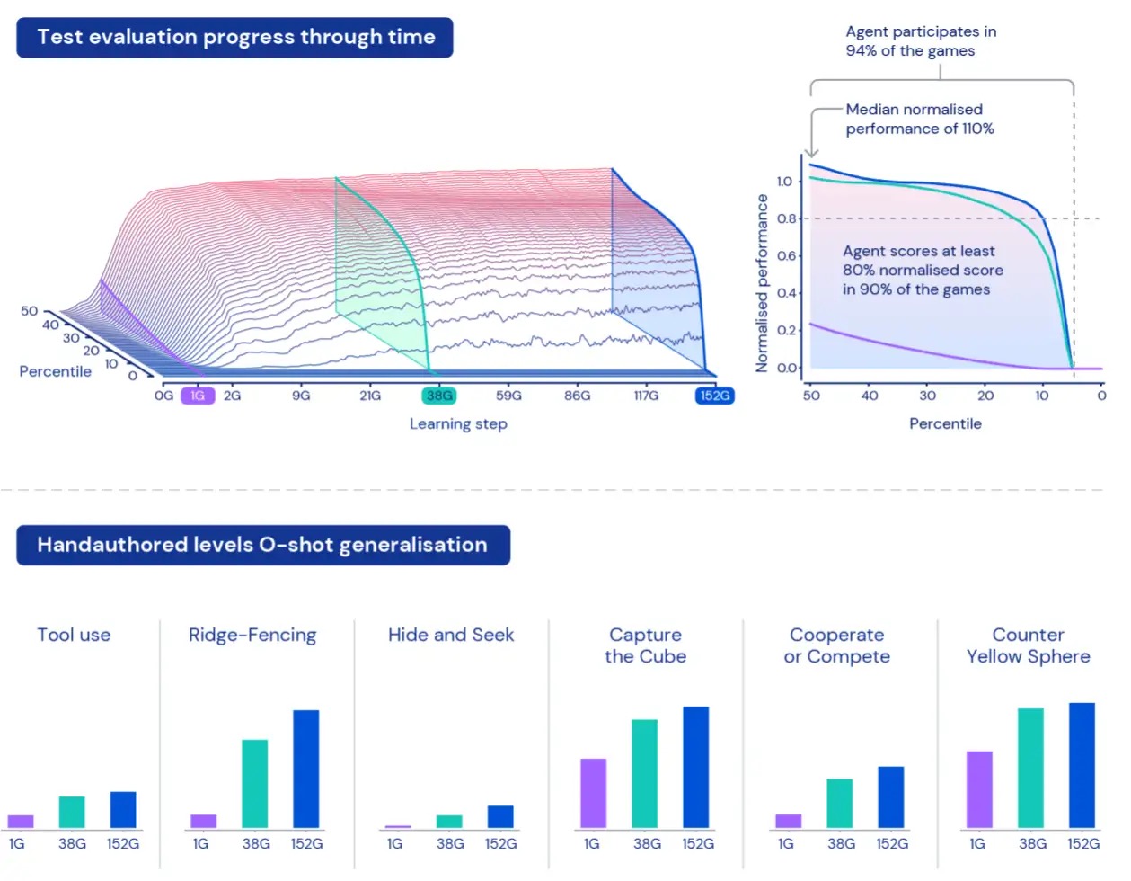Because of the size of XLand, understanding and characterising the performance of our agents can be a challenge. Each task involves different levels of complexity, different scales of achievable rewards, and different capabilities of the agent, so merely averaging the reward over held out tasks would hide the actual differences in complexity and rewards — and would effectively treat all tasks as equally interesting, which isn’t necessarily true of procedurally generated environments.