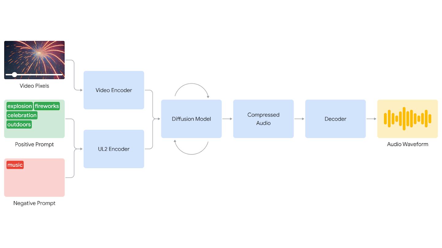 Diagram of our V2A system, taking video pixel and audio prompt input to generate an audio waveform synchronized to the underlying video. First, V2A encodes the video and audio prompt input and iteratively runs it through the diffusion model. Then it generates compressed audio, which is decoded into an audio waveform.