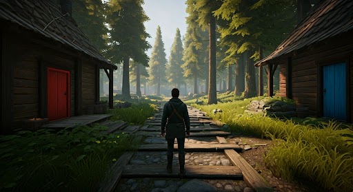 Prompt: "A screenshot of a third-person open world exploration game. The player is an adventurer exploring a forest. There is a house with a red door on the left, and a house with a blue door on the right. The camera is placed directly behind the player. #photorealistic #immersive"