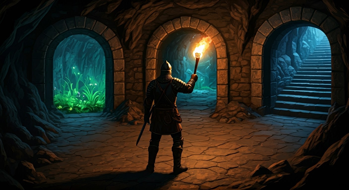 Prompt: "An image of a computer game showing a scene from inside a rough hewn stone cave or mine. The viewer's position is a 3rd person camera based above a player avatar looking down towards the avatar. The player avatar is a knight with a sword. In front of the knight avatar there are x3 stone arched doorways and the knight chooses to go through any one of these doors. Beyond the first and inside we can see strange green plants with glowing flowers lining that tunnel. Inside and beyond the second doorway there is a corridor of spiked iron plates riveted to the cave walls leading towards an ominous glow further along. Through the third door we can see a set of rough hewn stone steps ascending to a mysterious destination."
